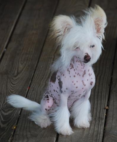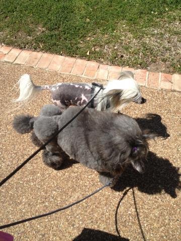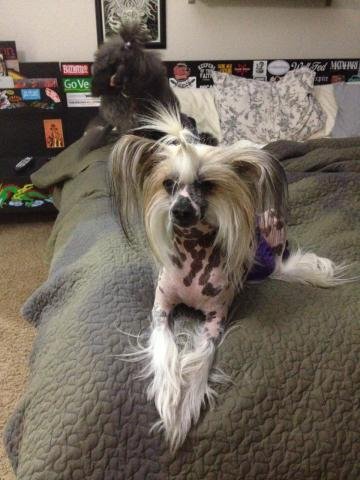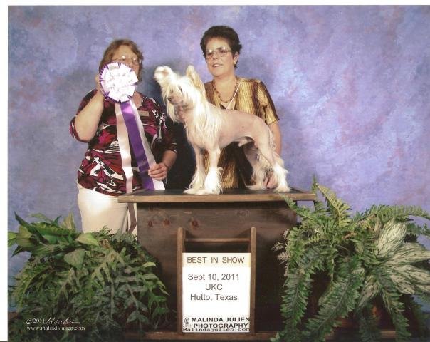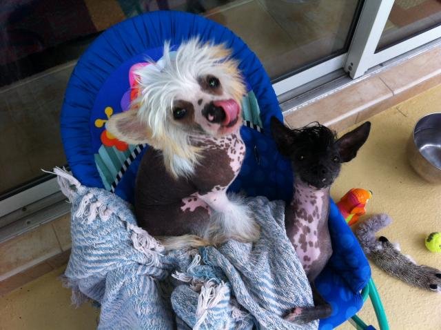 Harley weighed 12.8 lbs at the Vet the other day. Dr. Black says he is the Best Looking Crested that he has ever seen !!! (WE KNEW THAT, DIDN'T WE !!!) He stands over Bella, but she hold her own. Rene & Tom 8.31.2010